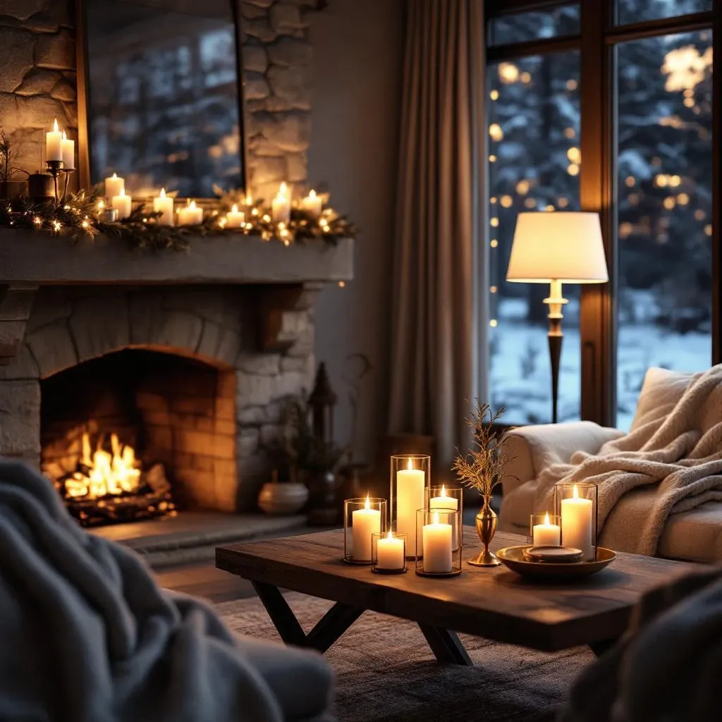 Dim the main lights and let the soft glow of candles and lamps create an intimate mood. Layer in cozy party lighting for extra warmth and atmosphere. Arrange candles (real or flameless) on the mantel, coffee table, and dining table. The flicker of a fire in the fireplace is the ultimate cozy touch. To complete the scene, use scents that evoke the season. A diffuser with warm spices like cinnamon and clove, or the scent of a simmering pot of mulled wine on the stove, will make your home smell like winter itself. For more inspiration, check out these tips on seasonal scents for parties.