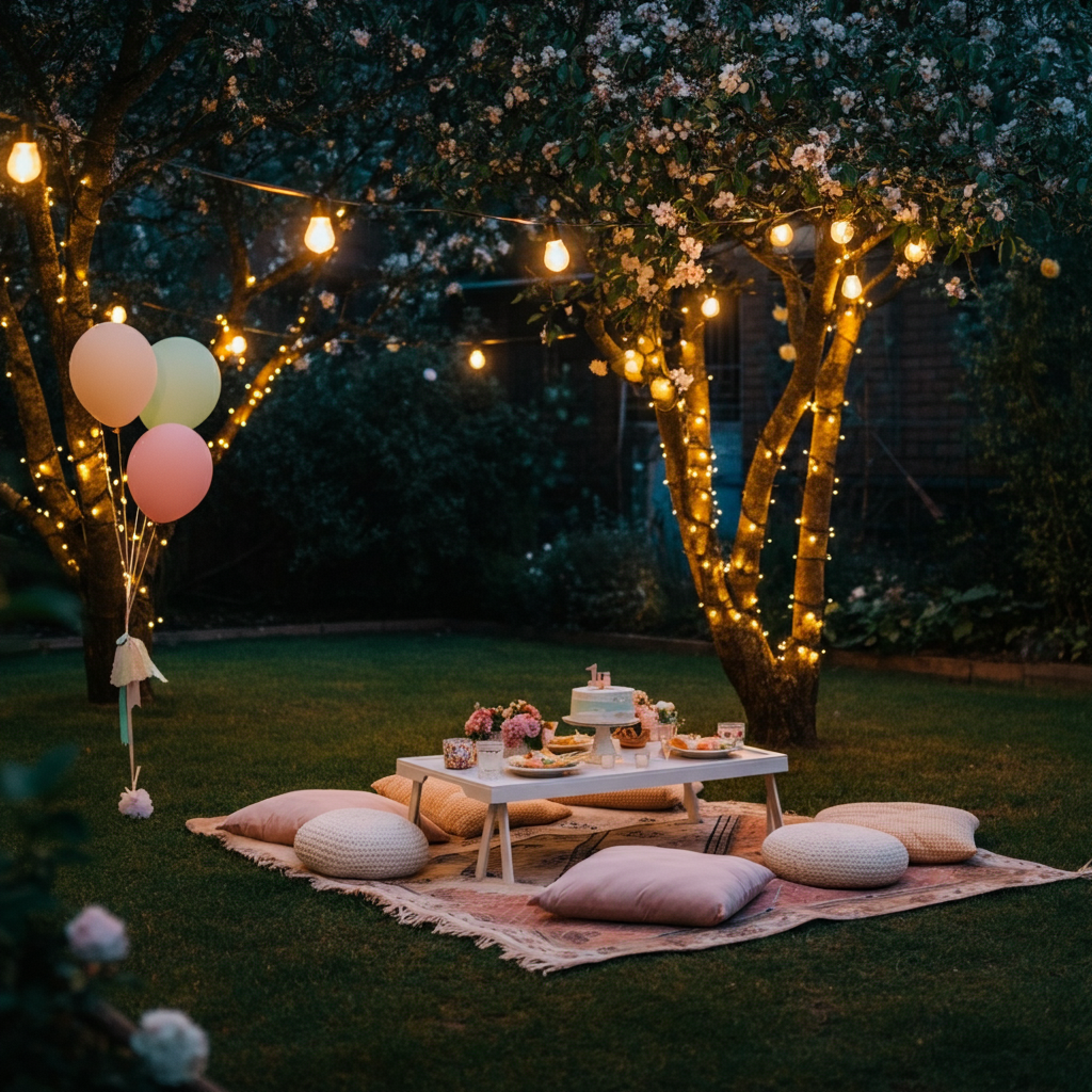 Floral designs, soft pastel balloons, and string lights can bring out the elegance of the theme. Opt for a color palette that includes white, blush, ivory, and peach for a fresh yet sophisticated vibe.