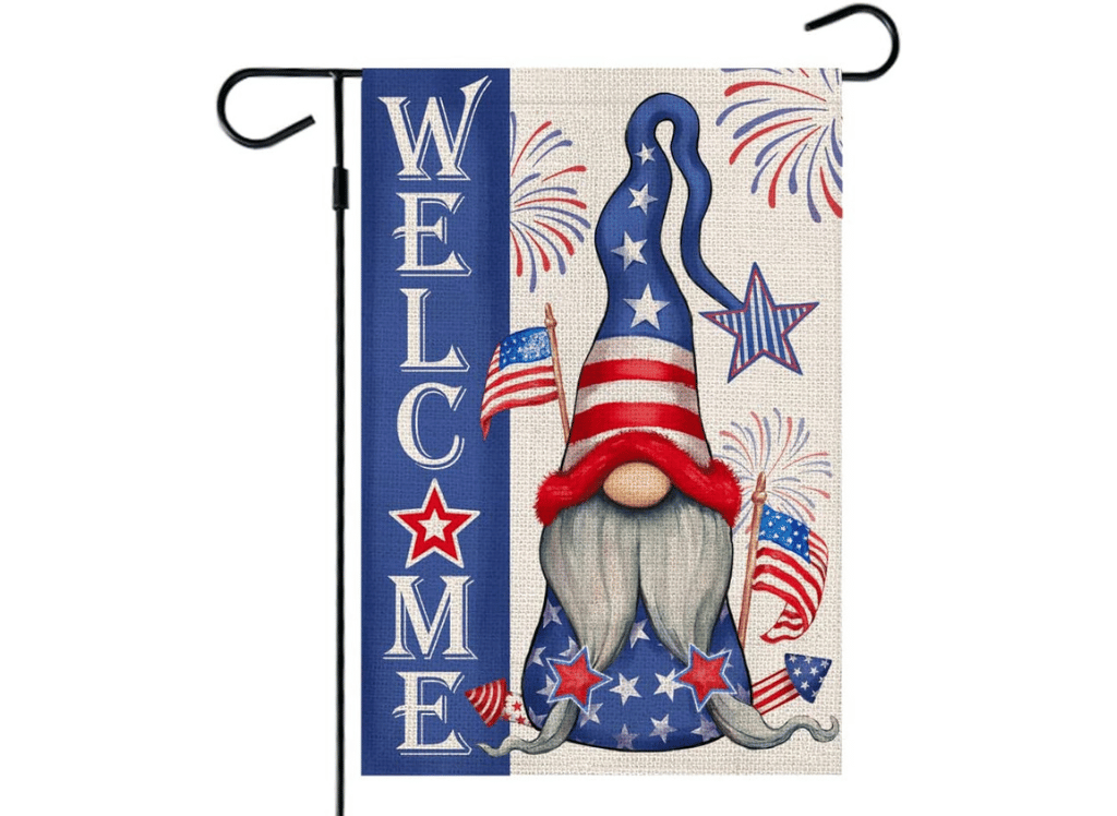Welcome the 4th of July with a festive and patriotic flair by displaying this Crowned Beauty Patriotic Gnome Garden Flag. This 12 x 18" flag is made from premium quality, burlap-looking Spun Polyester that is weather resistant as well as UV and fade-resistant. It also features a sleeve hanger that fits most standard Flag Stands. As an added bonus, it's machine washable for easy cleaning and maintenance. Show off your American pride with this beautiful garden flag!