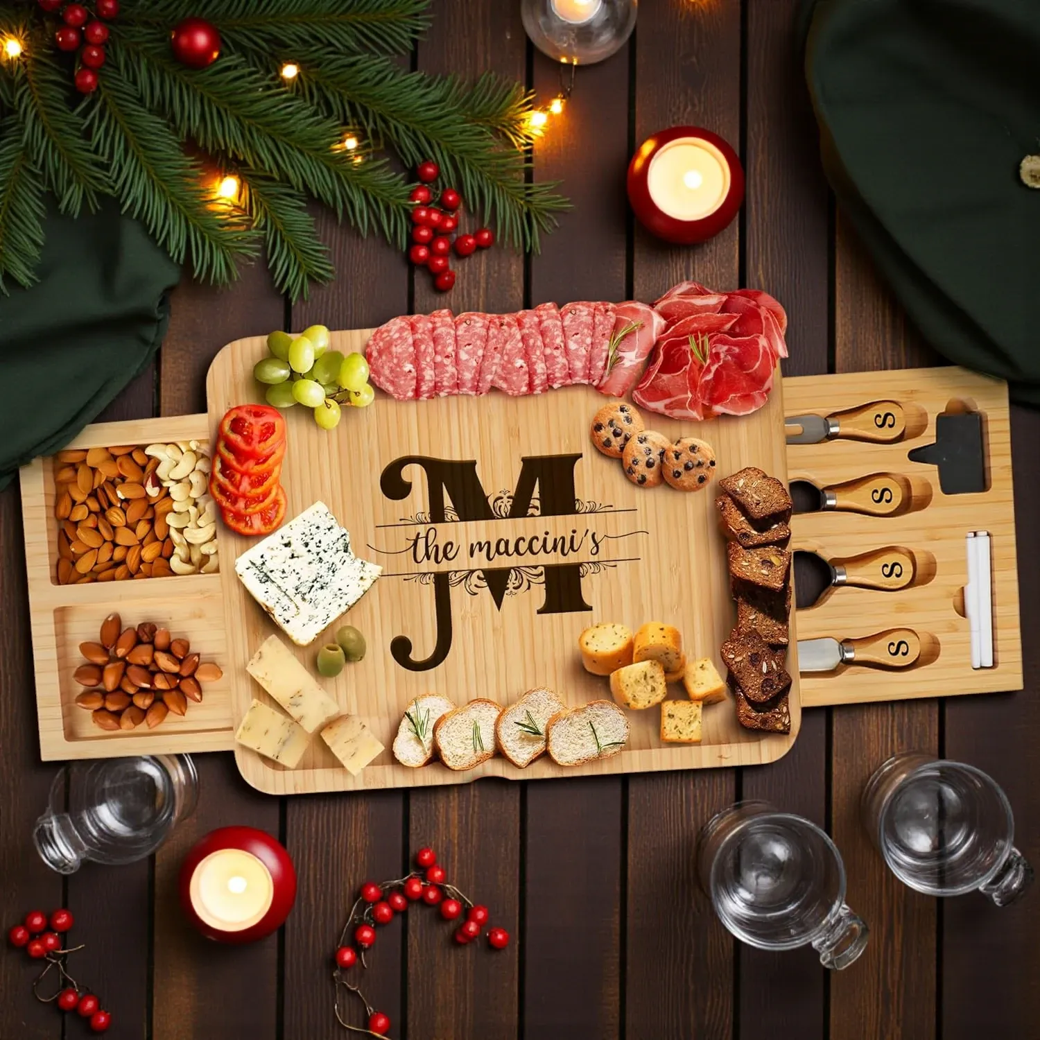 This eco friendly, durable bamboo board is carved with a custom family name or monogram, giving it a personal touch that elevates any room it’s displayed in. It includes built-in drawers to store knives, cheese tools, and spoons, keeping your setup organized and compact while saving drawer space. Hosting becomes a breeze: prepare your selection ahead of time, cover, and serve when guests arrive.