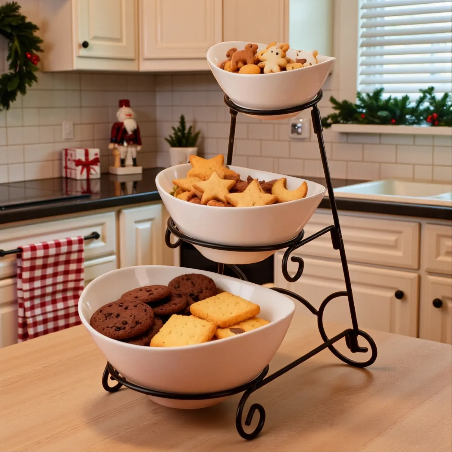 If counter space is tight (and during Christmas, it always is), these three-tier serving bowls are a lifesaver. Perfect for fruit, desserts, bread, cookies, or snacks, they create a vertical display that saves space while adding style to your holiday setup.