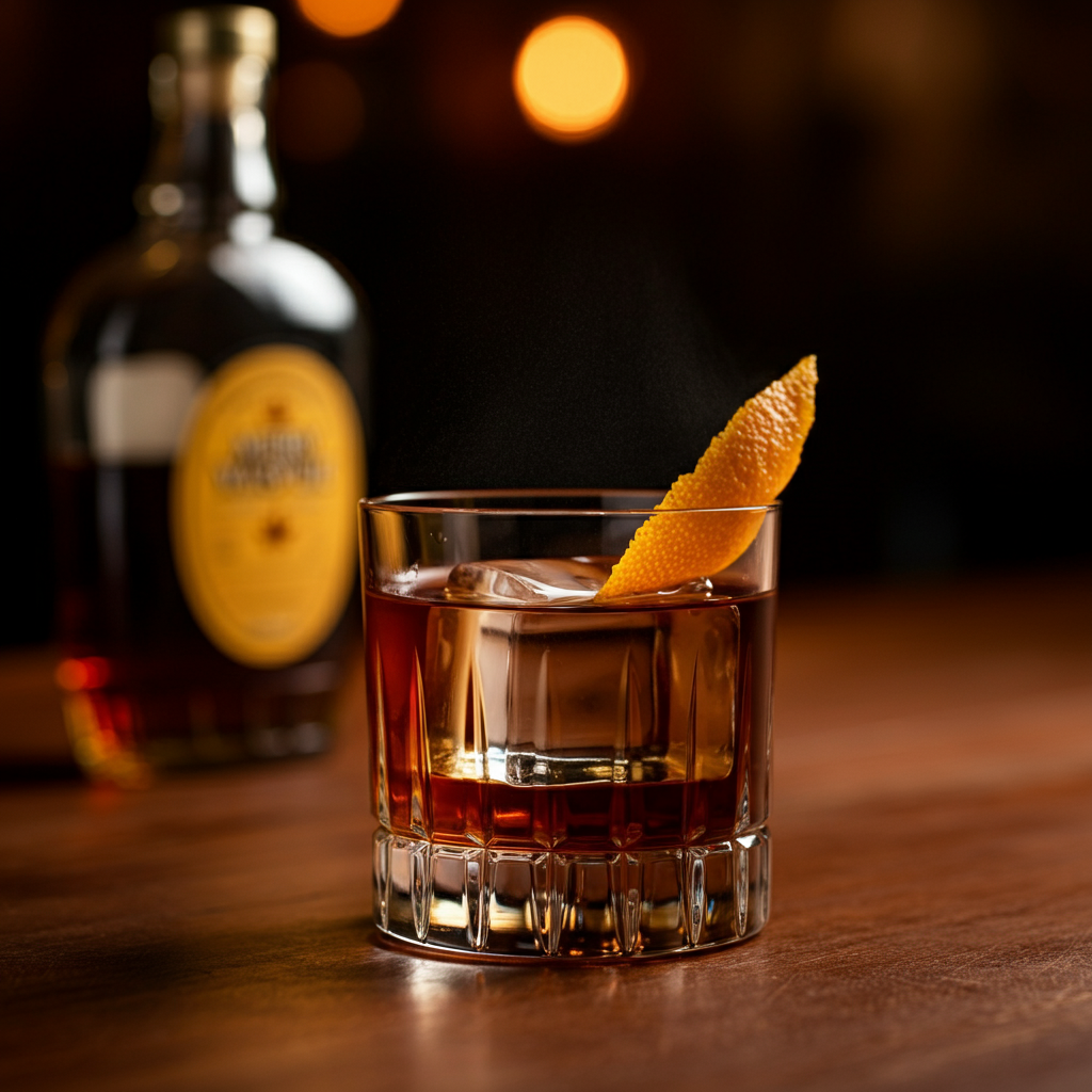 - Express an orange peel over the glass to release its oils, then drop it in as a garnish.