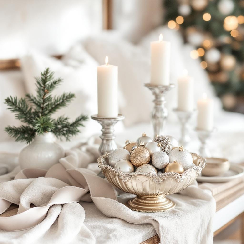 On your coffee table or mantel, swap out amber glass candle holders for ones in silver, gold, or mercury glass. A collection of metallic ornaments artfully arranged in a bowl can replace a display of gourds. You can also introduce neutral-colored ribbons made of velvet or satin, tying them around vases or existing decor. This gradual change introduces a subtle warmth and a hint of glamour, setting the stage for the Christmas season without feeling rushed.