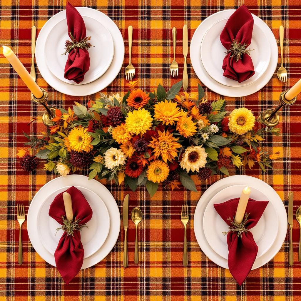 Styling Formula: Start with a plaid or patterned tablecloth in warm, autumnal colors. Use classic white porcelain plates and traditional silverware. The centerpiece can be a cornucopia or a low floral arrangement with fall flowers. Brass candlesticks add a final touch of warmth.