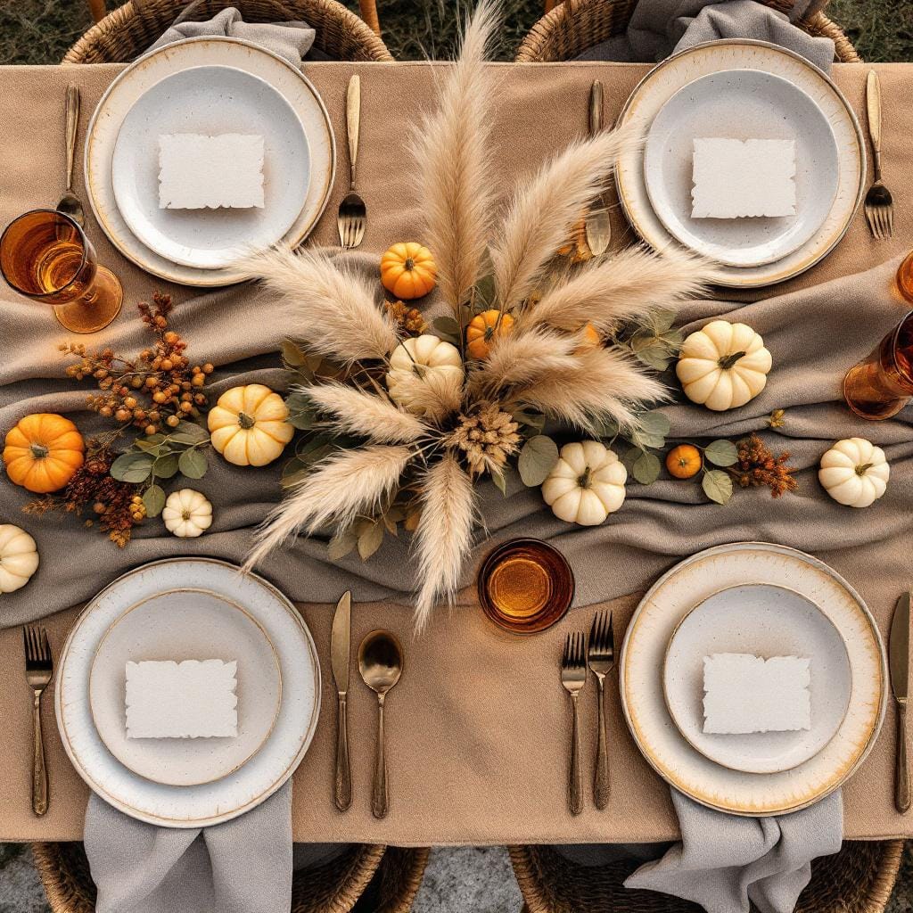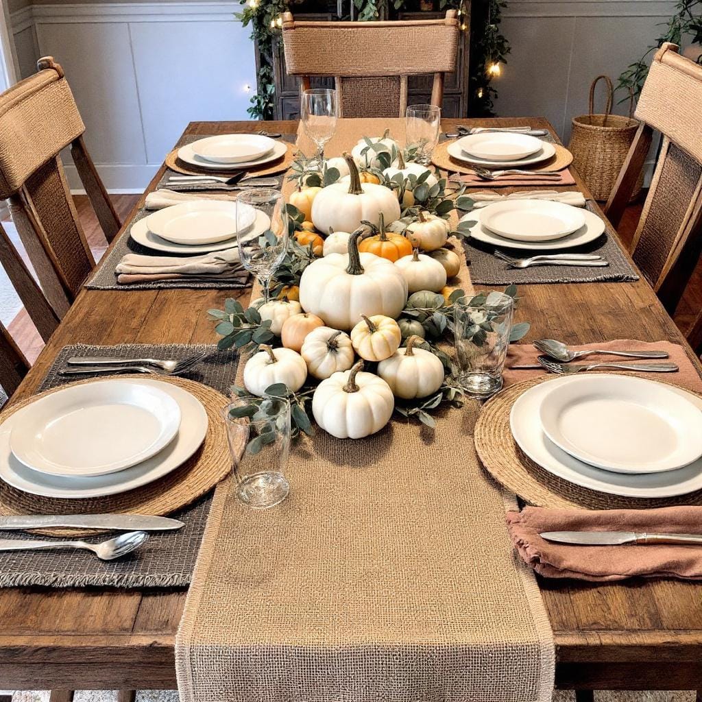 Styling Formula: Start with a neutral base like a burlap or linen table runner. Build a centerpiece with small white pumpkins, gourds, and eucalyptus sprigs. Use textured placemats and simple ceramic plates to complete the look.