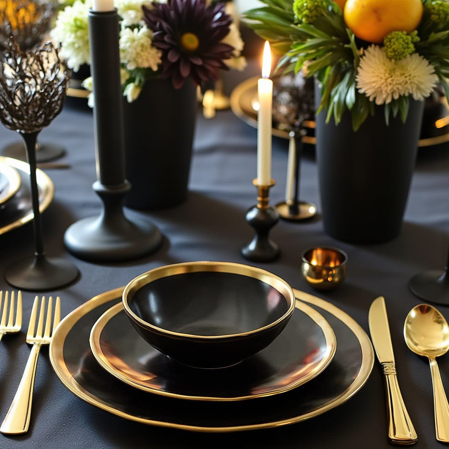 Styling Formula: Start with a dark tablecloth in navy, charcoal, or even black. Use gold-rimmed plates and gold flatware. Create a centerpiece with dark, moody flowers like deep red dahlias and dark foliage. Fill the table with dozens of candles at varying heights.