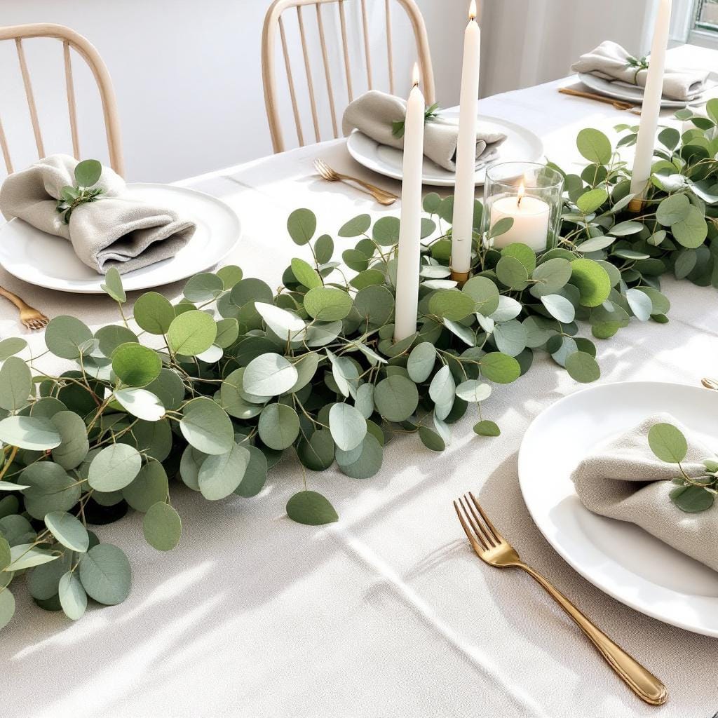Styling Formula: Use a simple white or natural linen tablecloth. Run a long garland of mixed greens (like silver dollar eucalyptus, olive branches, and rosemary) down the middle of the table. Weave in white taper candles. Keep place settings simple with white plates, clear glassware, and a green linen napkin.