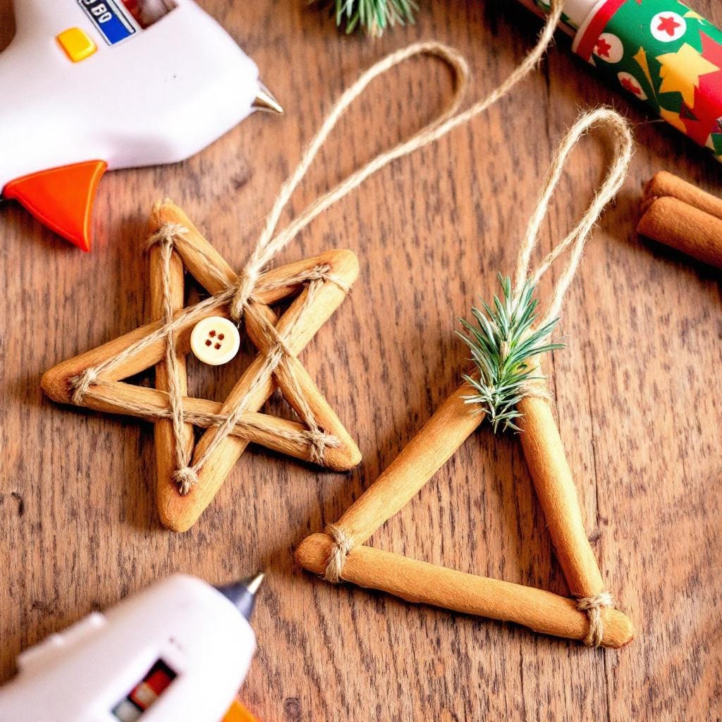 - Design Shape: For a star, arrange five cinnamon sticks in a star shape, overlapping the ends. For a tree, create a triangle with three sticks and glue a small piece of a fourth stick at the bottom for the trunk.