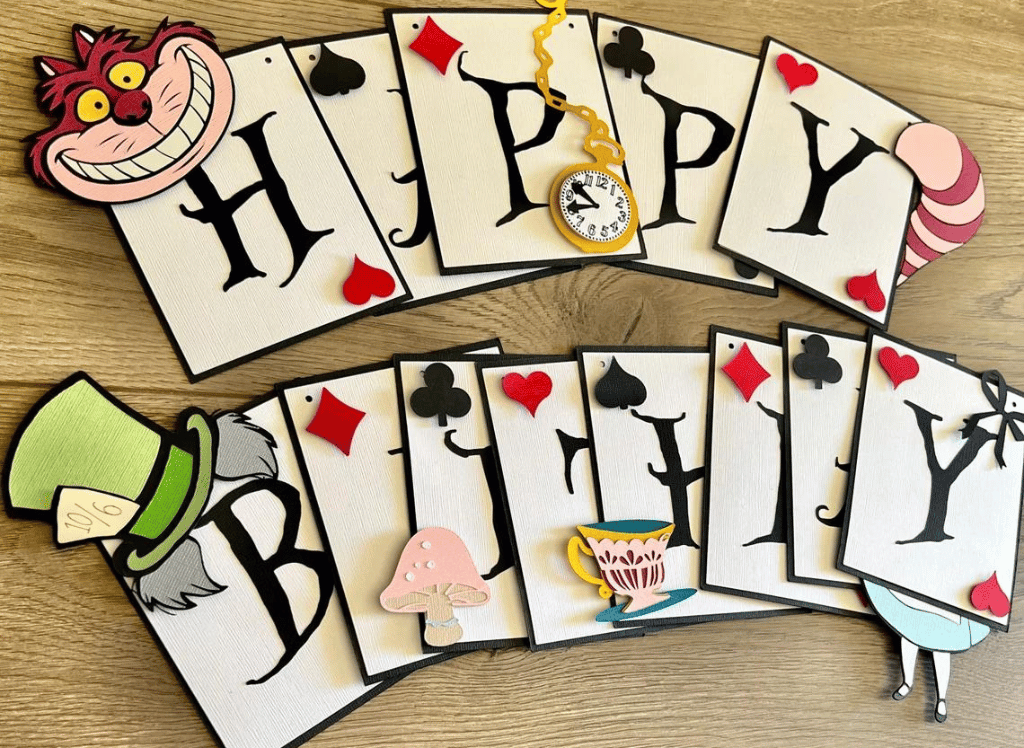 Transform your party space into a whimsical wonderland with this adorable โHappy Birthdayโ banner featuring beloved characters from the classic story including Cheshire cat. ๐