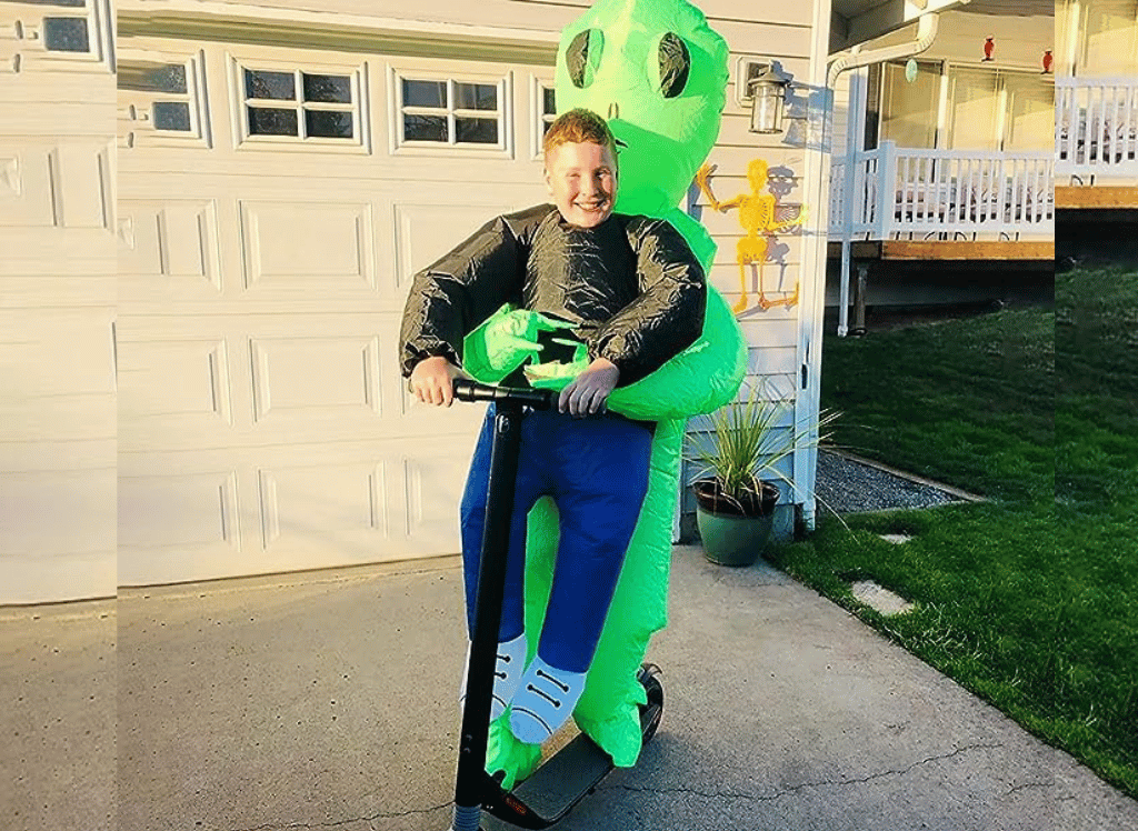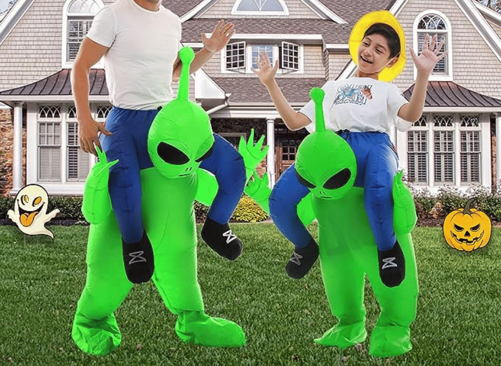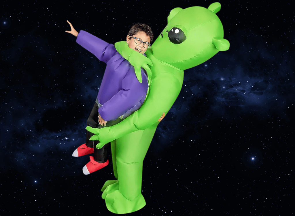 Make Halloween unforgettable for your kids this year with Spooktacular Creation's Alien Caught Me Deluxe Inflatable Alien Dress Costume. Perfect for kids between age seven and ten (3ft10â-4ft7â), this full body alien suit is sure to make any kid feel extra spooky. It comes with an instruction sheet, full body alien suit, and an air pump so youâre good to set off on your alien adventures -- all you need is a 4 AA batteries or portable battery bank (not included)! Even more exciting, you can use this costume for trick or treating, Halloween dress-ups, night events, costume parties, and more!