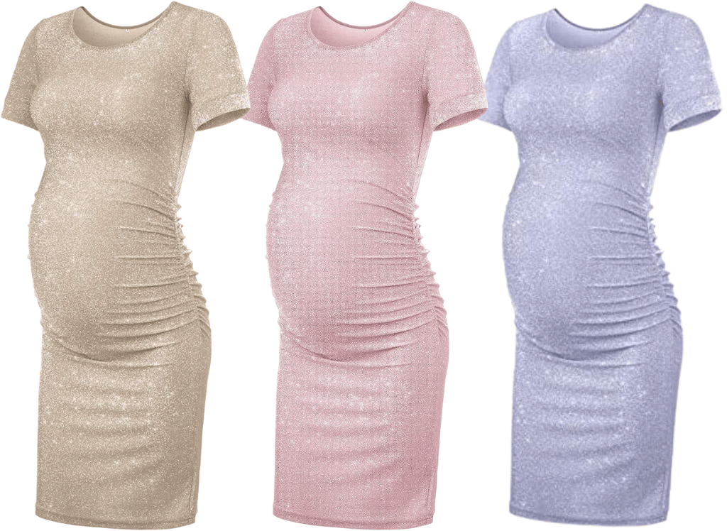 This KIM S Glitter Maternity Bodycon Dress is the perfect piece for any expecting mother! Not only is it made of a comfortable blend of Nylon, Glitter and Spandex, but its ruched side also provides plenty of room for your growing baby bump with a flattering silhouette. The dresses have shimmer and sparkle that will add some glamour to your maternity wardrobe.