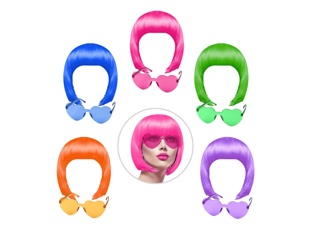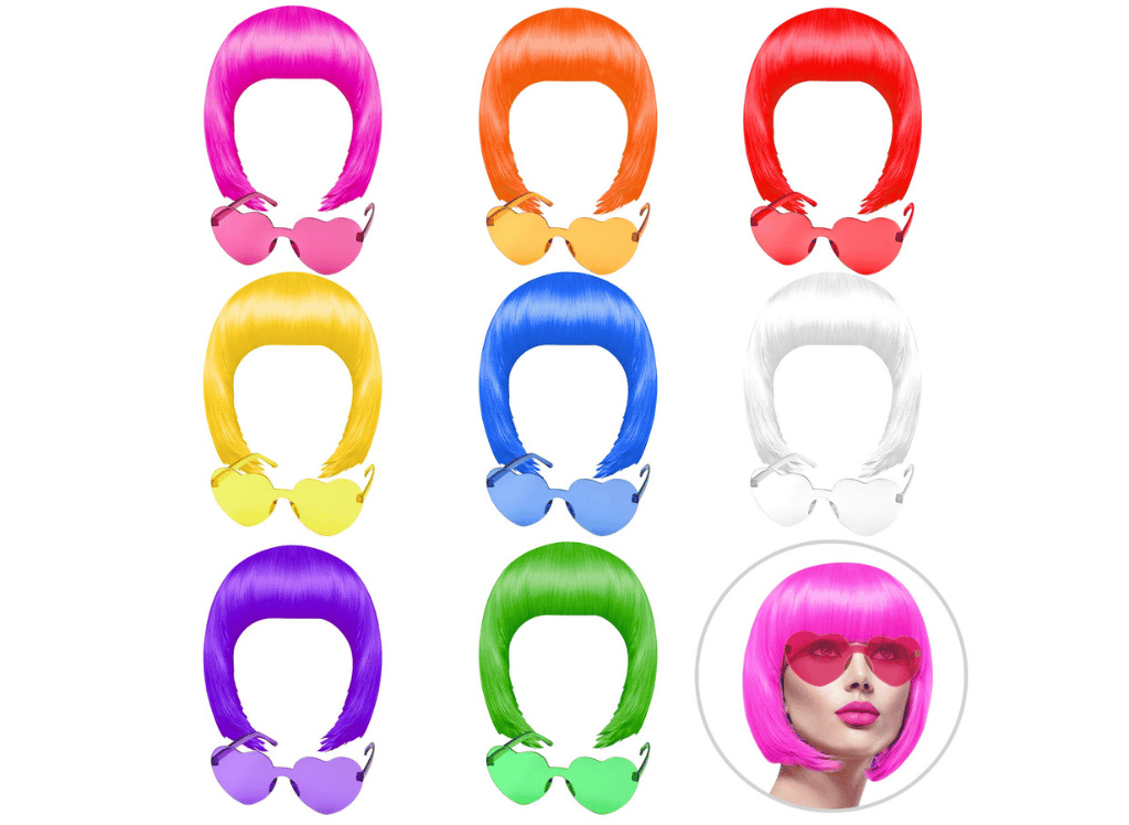 The KUUQA 10 Pieces Party Wigs and Sunglass Set is an ideal choice for bachelorette parties or any other events that require fashionable wigs. This set comes with five short bob wigs in different color shades and five heart-shaped glasses to complete the look. The bright colors of each piece provide plenty of styling options, allowing you to find the perfect combination for your needs. With this fun accessory set, you can be sure to make a statement as you hit the party scene!