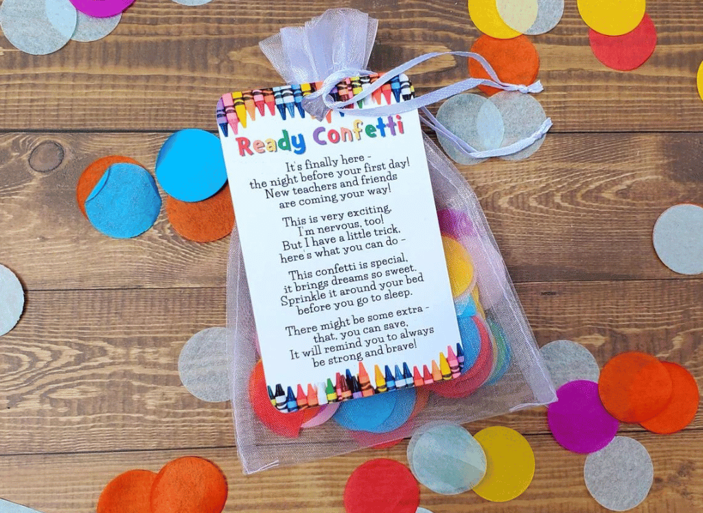 Kick off the school year with a sprinkle of magic thanks to Ready Confetti! This charming little bag of confetti, complete with an original poem, is perfect for settling those first-day jitters. Hand it out as a fun keepsake or let the kids enjoy throwing it in the air for a burst of back-to-school energy. It's a sweet tradition that adds a touch of sparkle to your celebration.