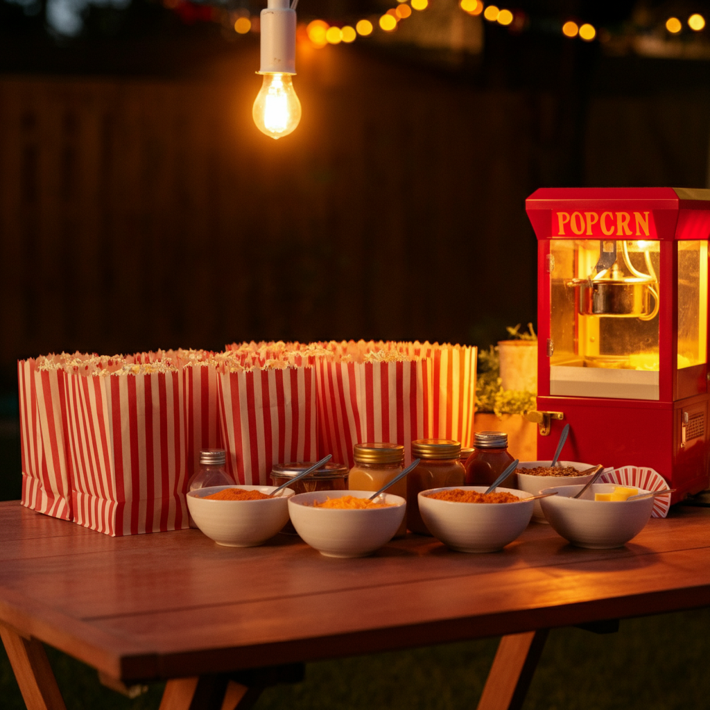 Add so much fun (and flavor) to your party food lineup with a popcorn bar. Chips can also be included as part of the vibrant snack options, enhancing the festive atmosphere. Set up a table offering freshly popped popcorn along with toppings like melted butter, cheese powder, or even caramel drizzle. It’s a budget-friendly snack that feels luxurious when presented carnival-style. Use striped paper bags to serve the popcorn, and you’ll nail the perfect balance between tasty treats and themed decor.