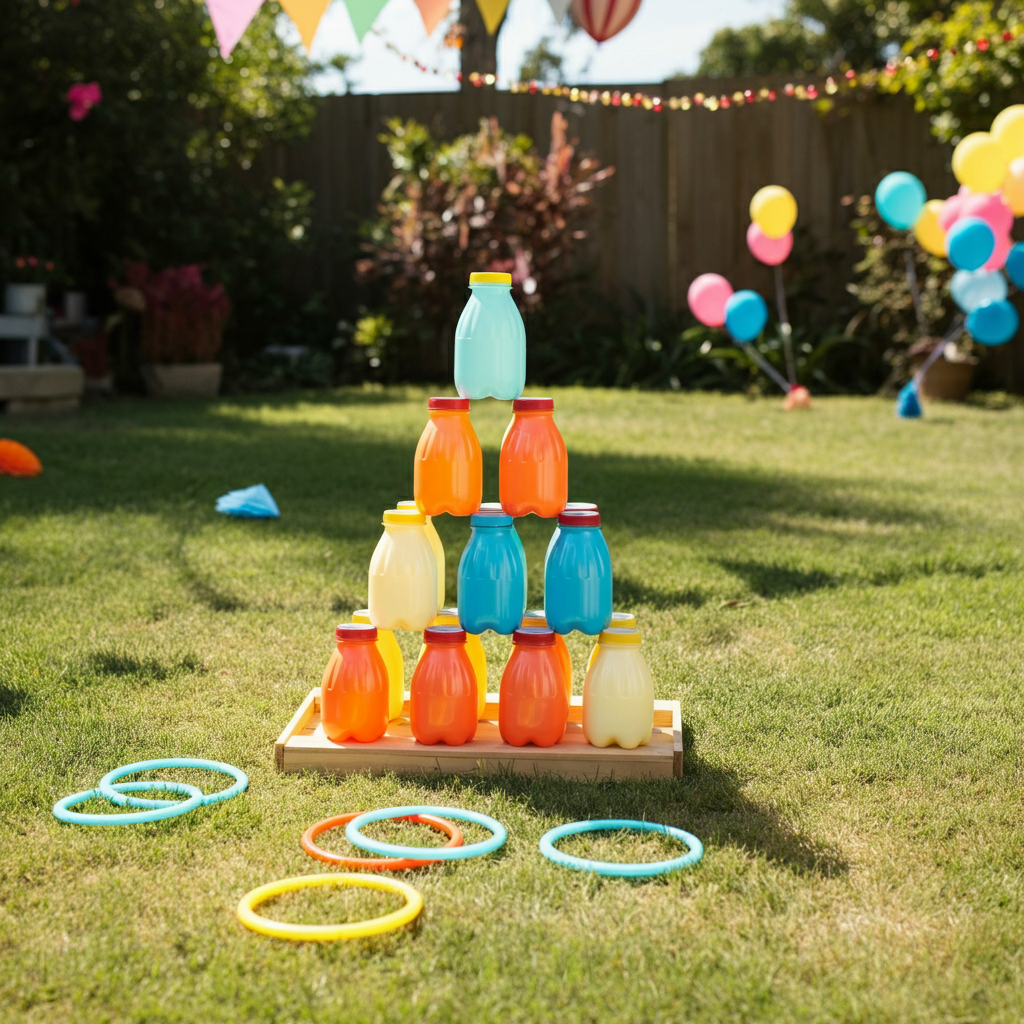 For a game that screams traditional carnival charm, a milk bottle ring toss is a must. Arrange glass or brightly colored plastic milk bottles, ensuring they are stacked for stability, and provide lightweight rings. Watch as kids try their best to land those rings around the bottles. It’s a game of skill and precision that’s just as enjoyable for parents to join in. Throw in tokens or tiny prizes for the winners to motivate everyone to give it a shot!