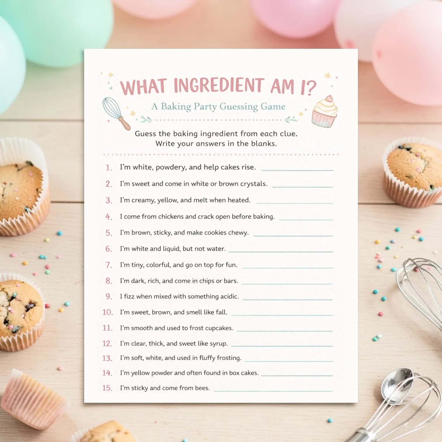 Looking for an easy activity to keep little chefs entertained while cupcakes bake? Try our printable “What Ingredient Am I?” guessing game. Kids read the clues and write their answers in the blanks — it’s simple, interactive, and perfect for ages 5–12.