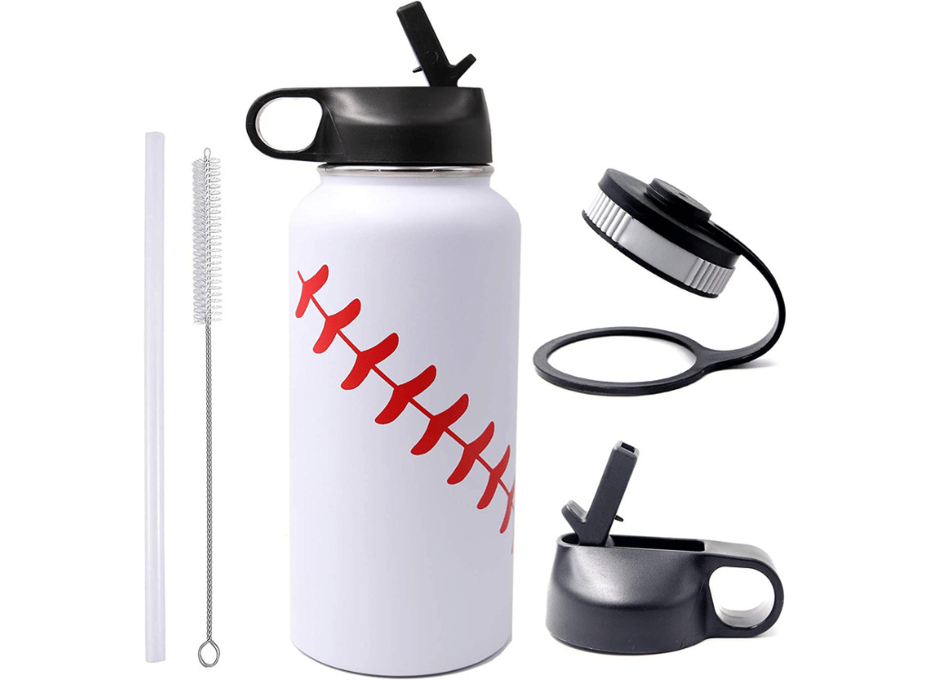 The FMYWZS 32 oz Stainless Steel Wide Mouth Baseball Water Bottle is an innovative and functional everyday refreshment delivery system. Constructed with high quality food grade 18/8 stainless steel, this water bottle is designed to last for years of reliable use. Featuring double-walled vacuum insulation technology, the FMYWZS water bottle keeps beverages iced for 6 hours, cold for 24 hours, and hot for up to 8 hours. It also has two lids - a wide mouth BPA-free lid perfect for office or hiking adventures along with a straw lid fit better suited for cycling or road trips. This durable powder coated water bottle fits easily into any carry bag so you can take it anywhere with ease!