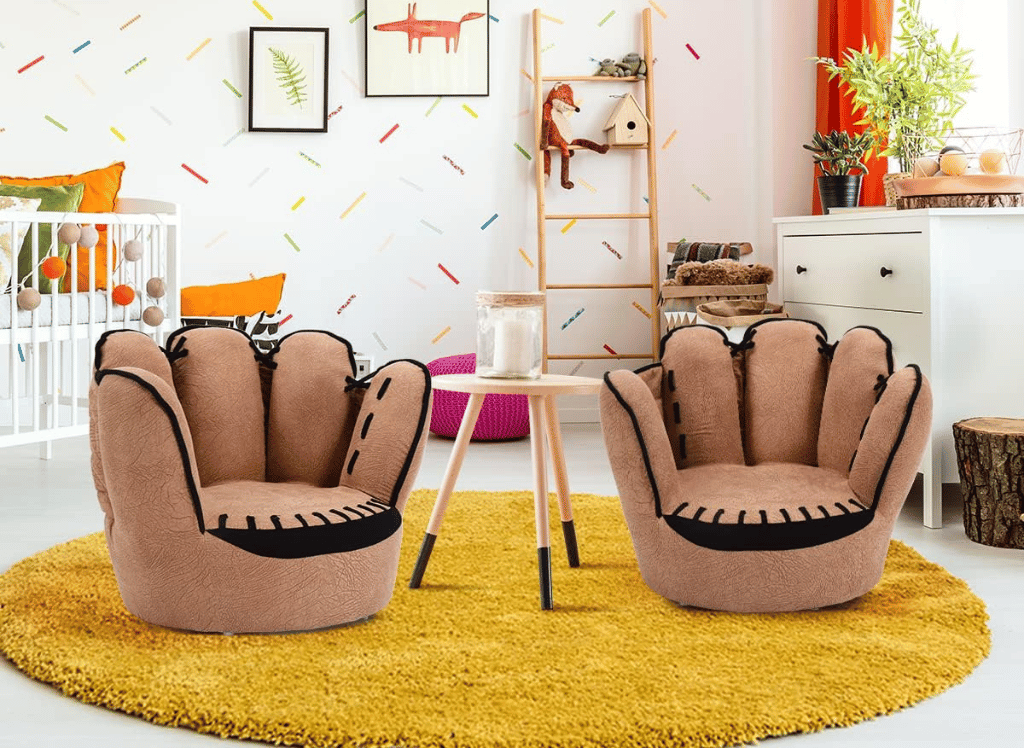 The Costzon Baseball Glove Kids Couch is a unique and eye-catching armchair designed with five fingers shaped like a baseball glove. The size of the chair is perfect for children aged 3 to 5 years old, weighing only 9 lbs so that they can move it easily without adult help. The seat has been padded with 20D sponge and covered in soft faux suede fabric which ensures comfort while making it easy to take care of. It conforms to the USA standard, featuring eucalyptus wood and P2 grade plywood construction for added durability, as well as plastic foot pads at the bottom to protect from wear and tear. This sturdy little armchair provides long-term performance with a strong load bearing capacity of up to 110lbs.
