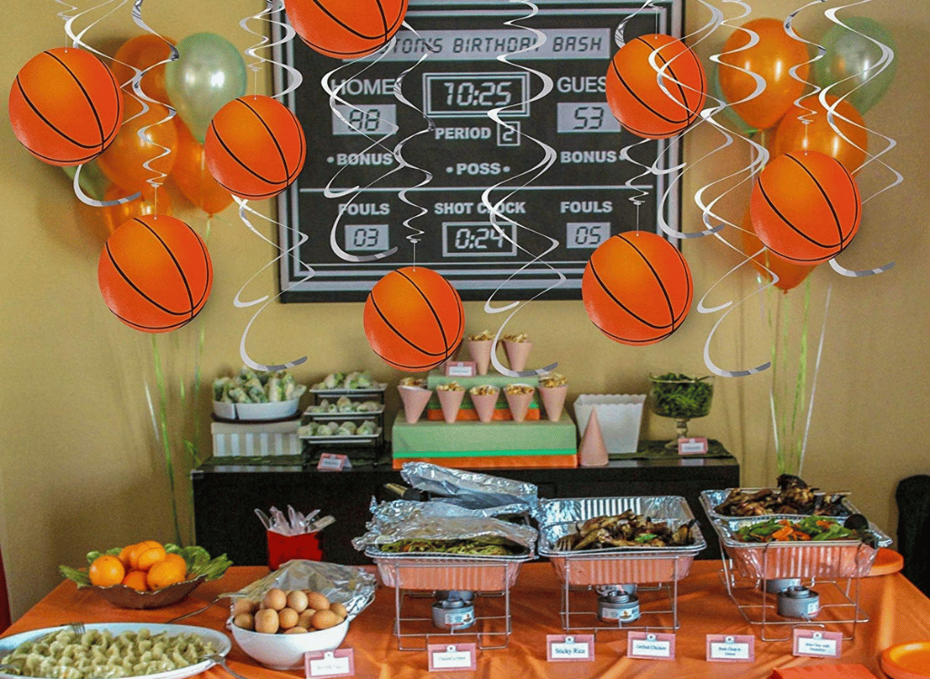 You can use basketball-themed banners, balloons, and tablecloths. Don't forget to hang some basketball swirl decorations from the ceiling. Setting up a basketball hoop in your backyard or living room will also add to the ambiance.