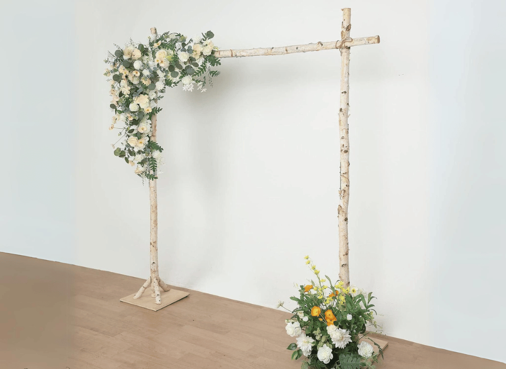 The natural birch wood and square frame design lend a modern, yet earthy feel to your ceremony. This arch is best suited for minimalist beach weddings, complemented by simple, elegant white florals like orchids or calla lilies, and minimalist greenery such as eucalyptus.
