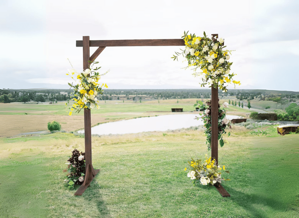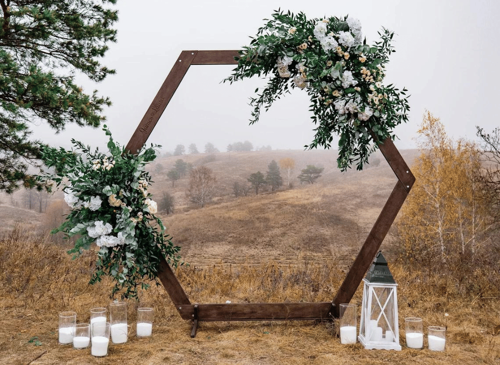 The unique hexagonal shape and personalization options make this arch perfect for bohemian beach weddings. It pairs beautifully with vibrant, wildflower arrangements, incorporating sunflowers, lavender, and dahlias, to highlight a free-spirited, colorful celebration.