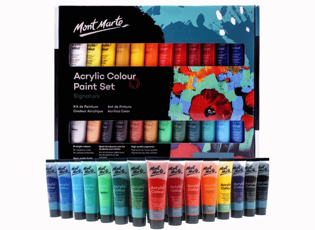 The Mont Marte Acrylic Paint Set enriches any artist's collection with 24 vibrant colors that vividly enhance your artwork! Suitable for canvas, wood, or leather, its creamy texture and quick drying time allow for easy color layering without muddying. It's the ideal set for unleashing your creativity on various surfaces. 🎨✨