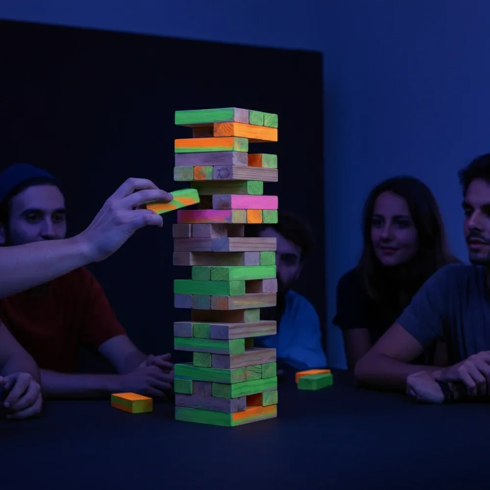 Not every moment of the party needs to be loud or physical. Dark jenga is perfect for winding things down while keeping the glow alive.