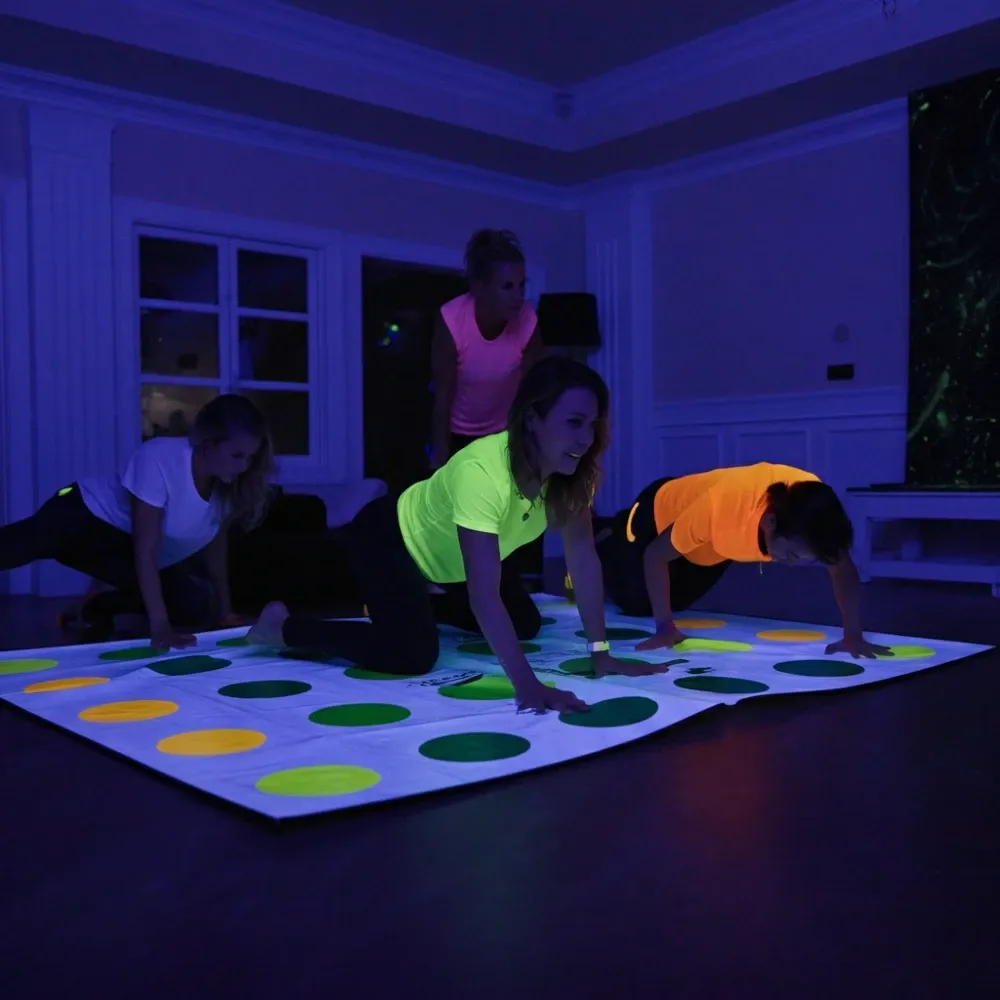 Use glow paper or neon tape to mark circles on the floor. Players twist, bend, and balance as the caller calls out body positions. It gets competitive, funny, and physical fast.