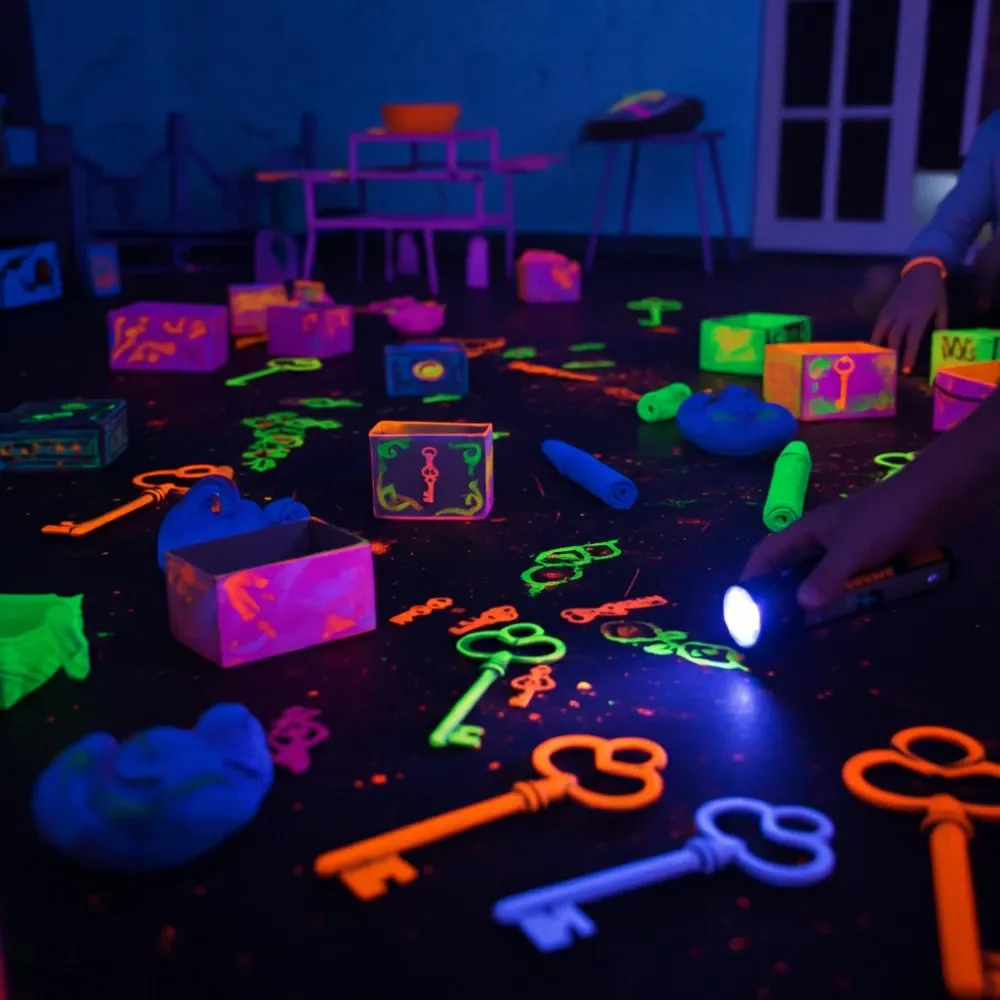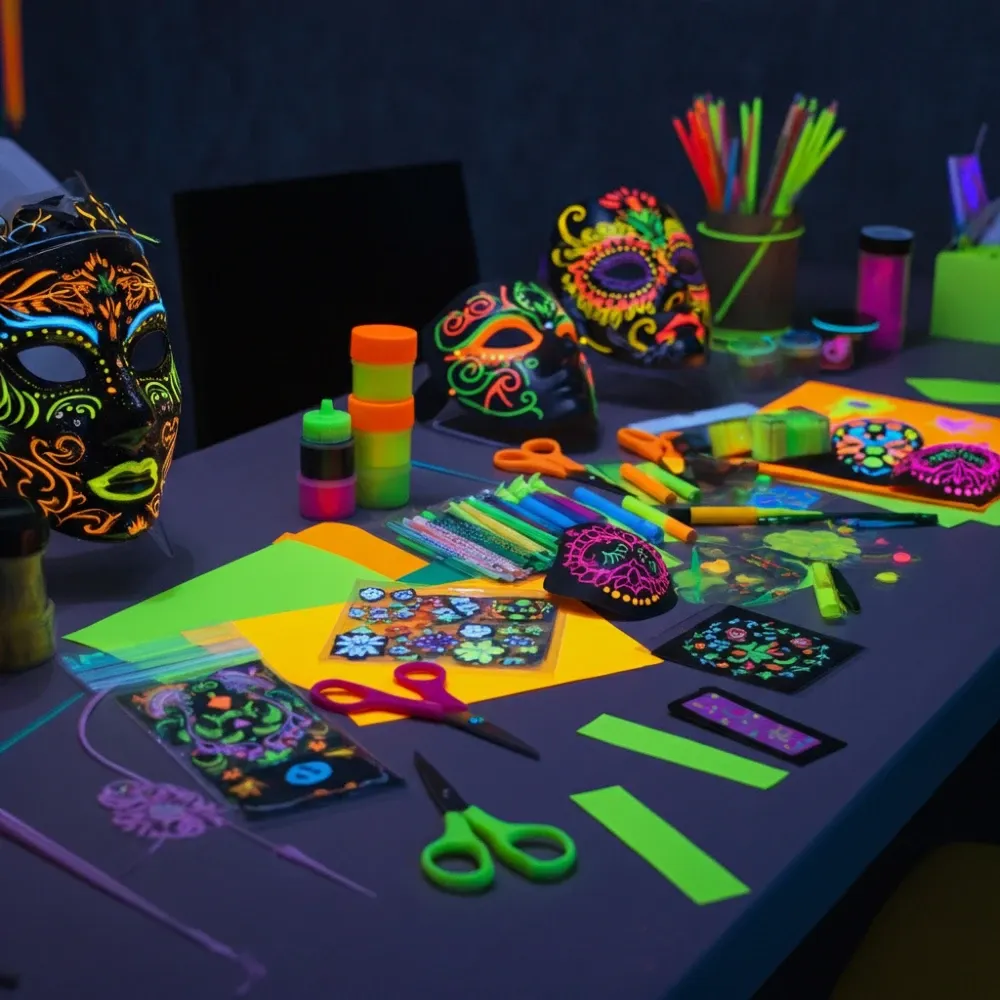 Black lights are what turn ordinary supplies into glowing magic. Neon tape, glow paper, body paint, and even water bottles come alive once the lights go dark.
