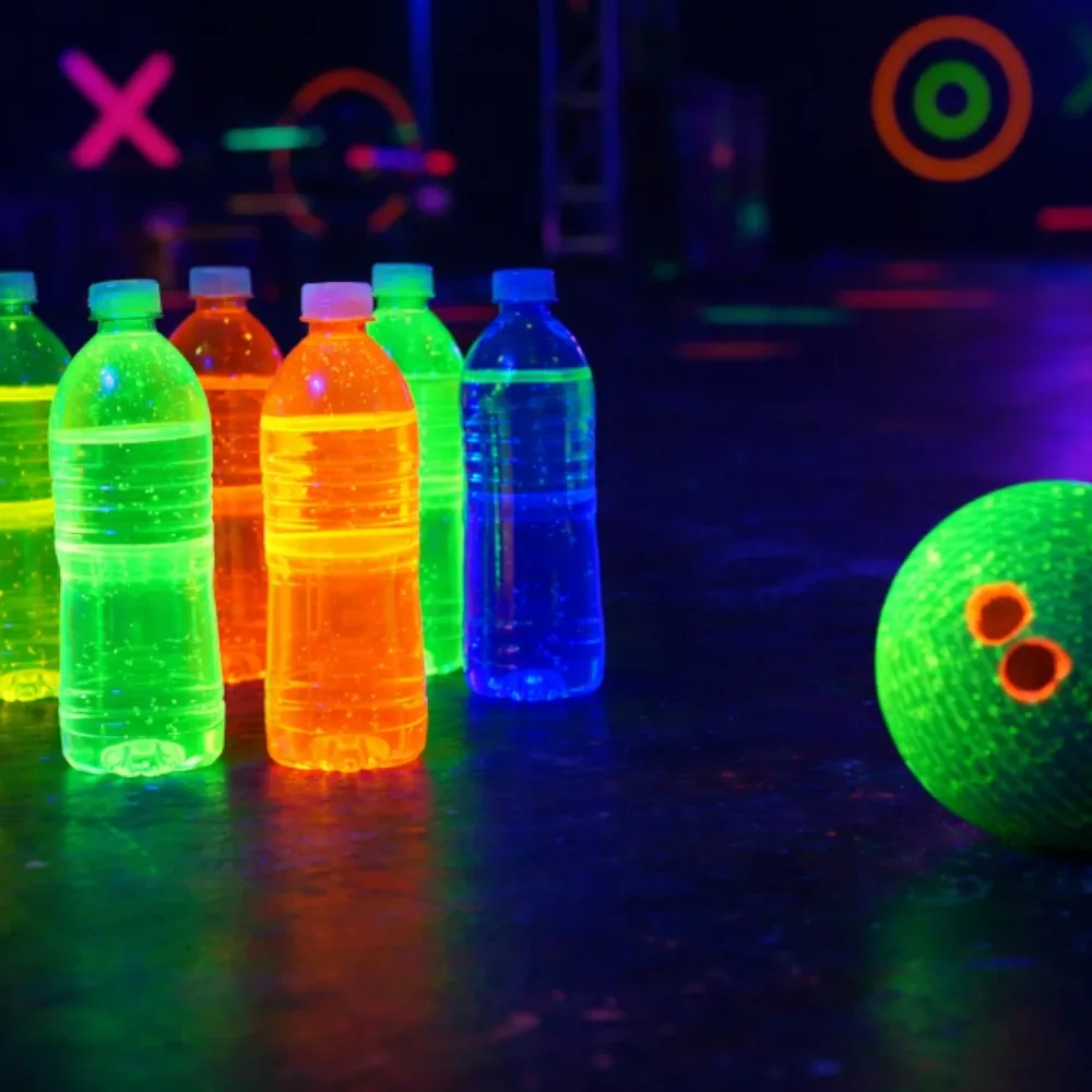 Fill water bottles with glowing paint or glow sticks and line them up as pins. Roll glow balls or color powder balls toward the pins.