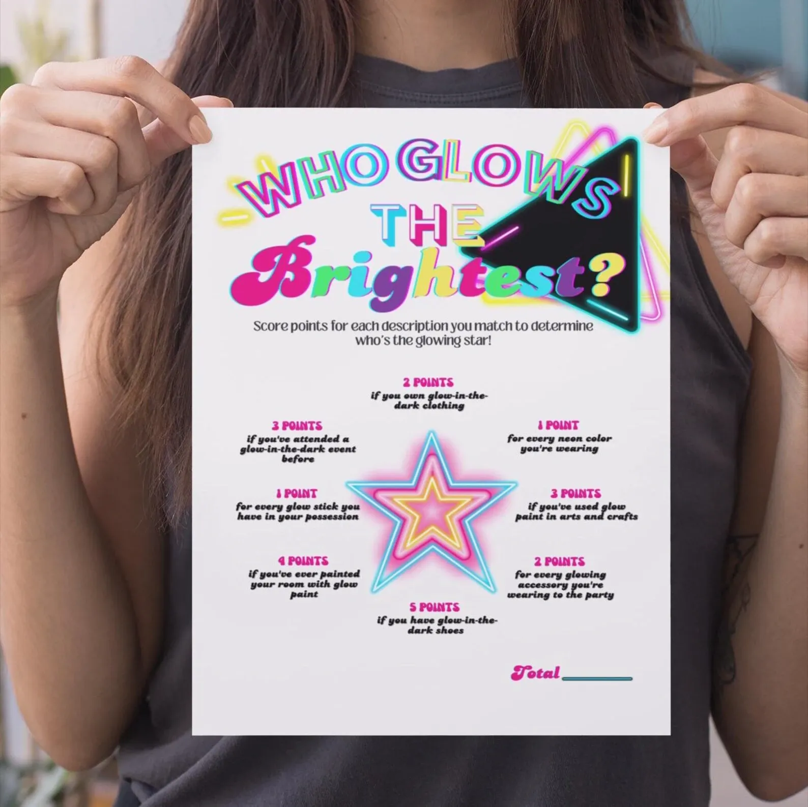 Players earn points based on glow gear, neon outfits, and glow-in-the-dark accessories — then tally scores to see who’s the glowing star of the party.