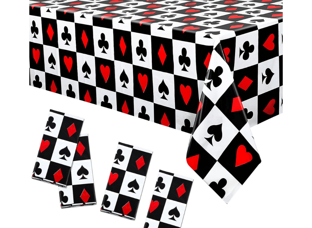 Casino party supplies can include tablecloths with card or dice designs, large playing cards, balloons in black, red, and white, and a welcome sign in the style of a Vegas marquee.