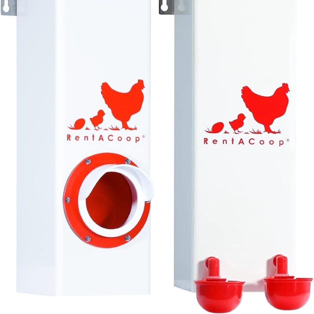The RentACoop Twin Cup Chicken Waterer and Feeder Set is the Swiss Army knife of poultry feeders and waterers. Itâs designed with efficiency in mind to save on wasted feed while keeping fresh water flowing for your chickens.