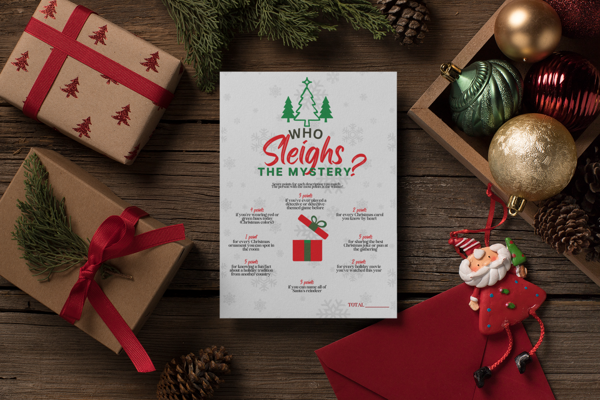 Engage your guests with a lively round of Christmas Charades. Whether they're portraying a dancing sugar plum fairy or the nutty professor from that one holiday film, this game guarantees a flurry of fun and laughter!