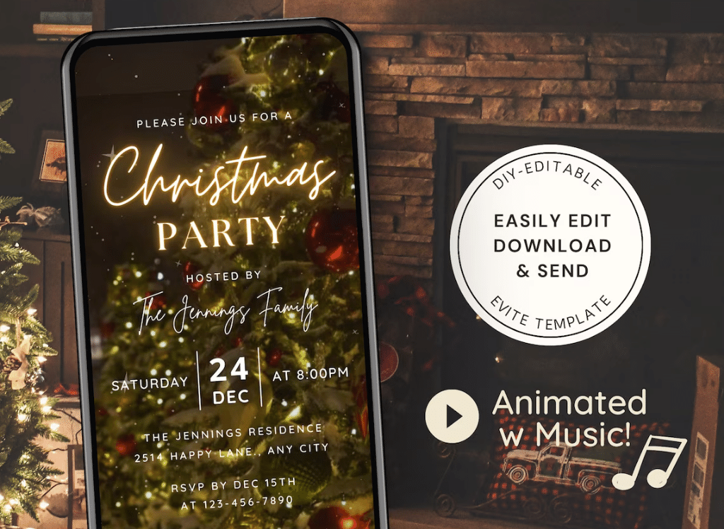 Get ready for an unforgettable Christmas party experience with these animated Christmas Party Invitations! This editable mobile invitation brings the festive spirit to life with its digital features. Imagine your guests receiving an invitation that not only looks amazing but also plays cheerful holiday music, setting the perfect tone for your dinner Christmas party. It's the ideal way to engage your friends and family in a fun and interactive way. Share the joy via text message, email, or on social media, and let the party planning begin!