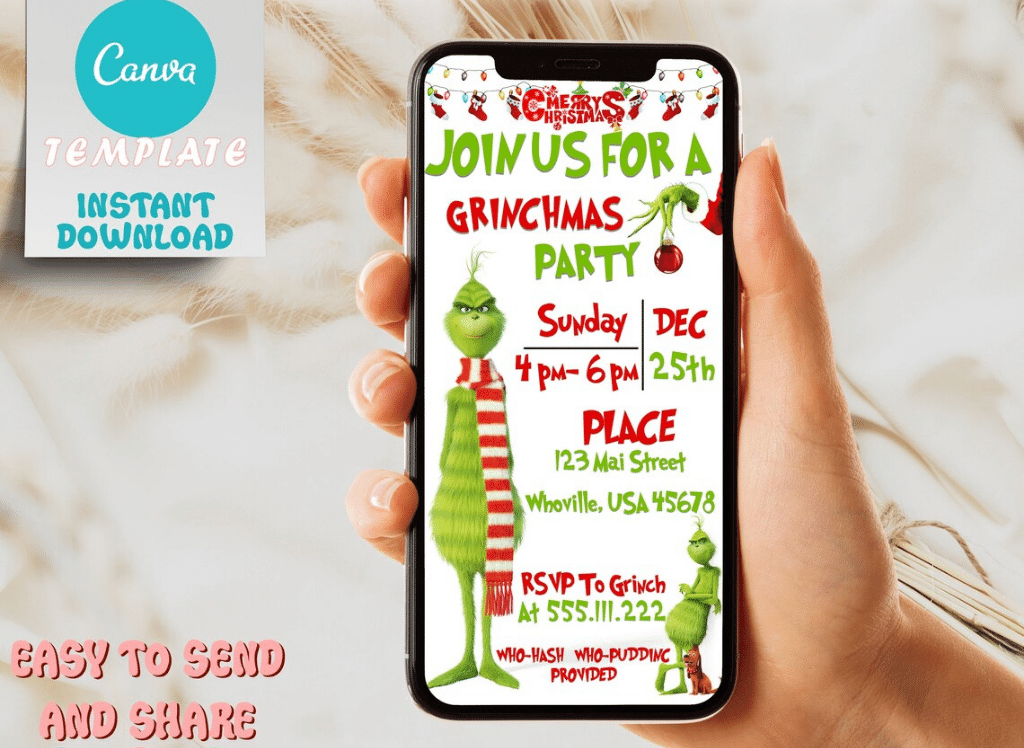 Get ready to bring the Grinch magic to your Christmas party with these Editable Grinch Party Instant Download Invitation! This merry invitation is perfect for your ugly sweater party or pajama party. Picture this: your guests receiving this playful invitation, adorned with the mischievous Grinch himself, setting the tone for a fun-filled evening. It's a fantastic way to infuse a touch of whimsy into your holiday festivities. So, grab your favorite ugly Christmas sweater and get ready to spread some Grinchmas cheer!