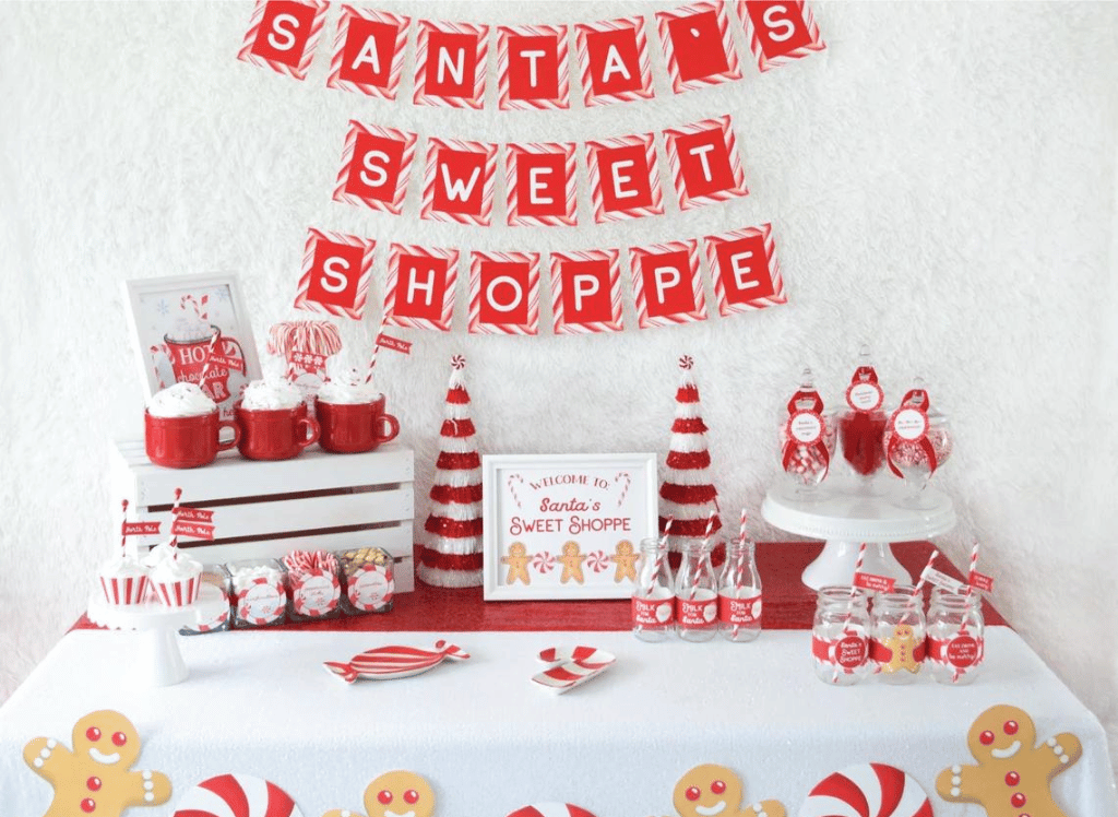 Start by adorning your venue with vibrant decorations like a "SANTA'S SWEET SHOPPE" banner to set the tone of sweetness and joy. Add a peppermint garland that wraps around the room, infusing it with the refreshing scent of peppermint. To complete the transformation, include gingerbread cutouts of various shapes and sizes, bringing the whimsical charm of gingerbread houses to life. With these delightful details, your venue will truly become a Candy Cane Christmas party wonderland, enchanting your guests and creating lasting memories.