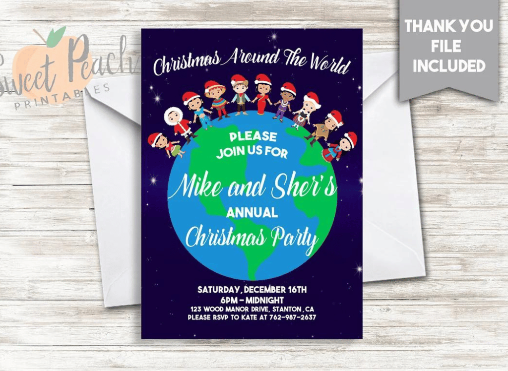 Get ready for the ultimate Christmas celebration! Christmas Around The World is a festive extravaganza that brings together the rich traditions and customs from different cultures. It's a global holiday party like no other, where you can experience the joy and warmth of Christmas from every corner of the globe. These invitations are the perfect way to kick-start the festivities, setting the tone for an enthusiastic, playful, and conversational gathering. Let's come together and make this Christmas a truly memorable and joyous occasion!