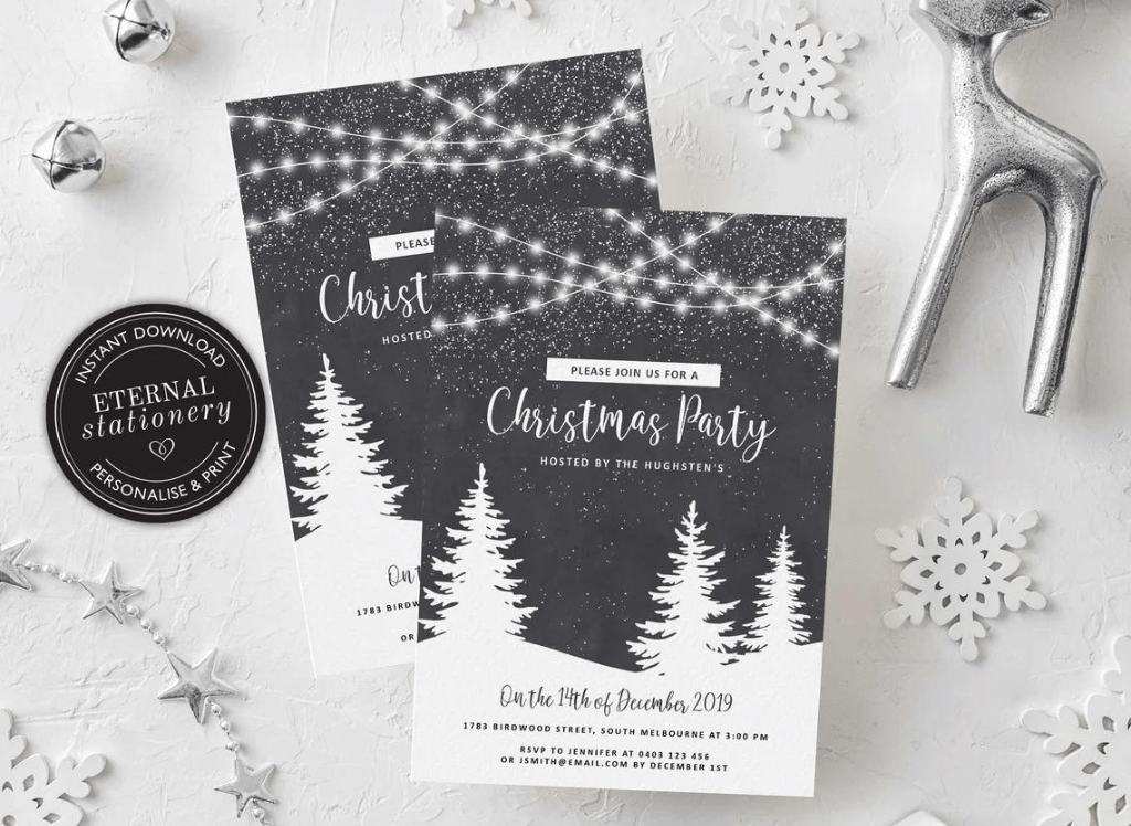 Step into a Winter Wonderland Party where the magic of the season comes alive! Picture a snowy landscape adorned with elegant white Christmas tree against a mesmerizing black backdrop. This editable invitation template sets the stage for an unforgettable celebration. With its versatility and charm, it's the perfect tool to bring your party theme ideas to life. So, let your creativity run wild and create an enchanting event that will leave your guests in awe.