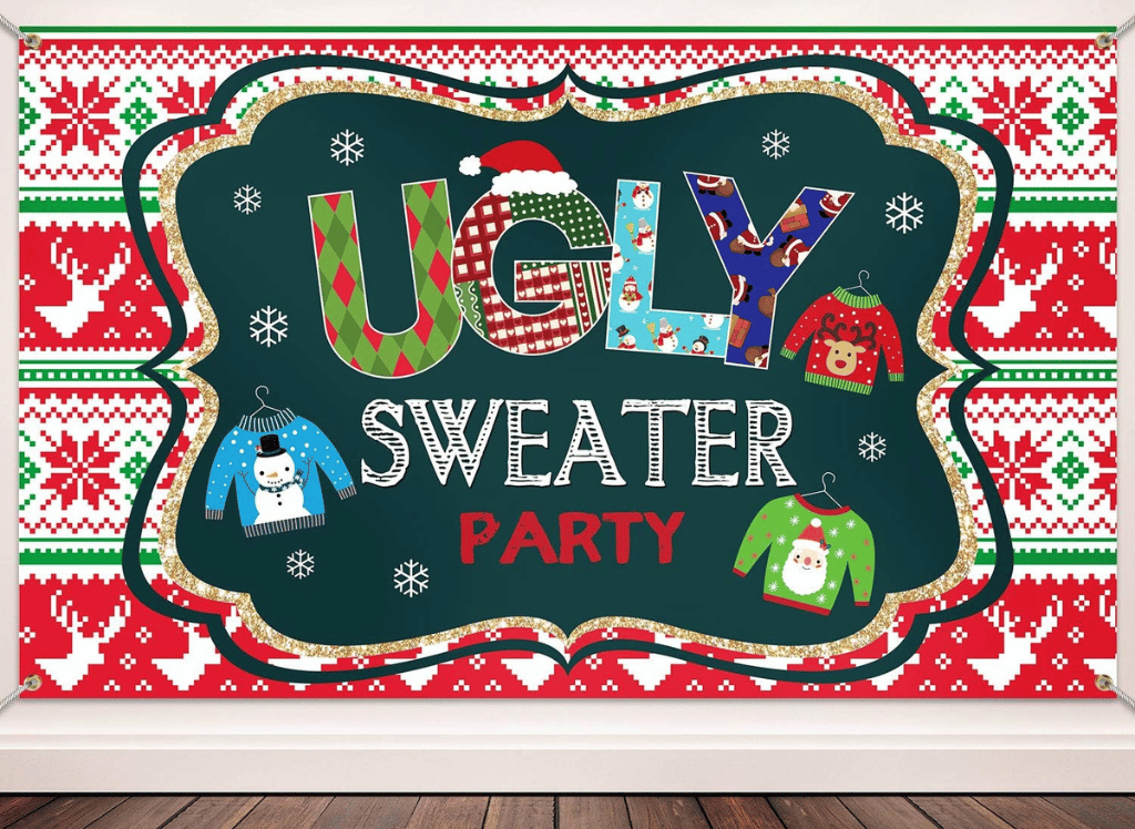 Have you ever been to an Ugly Christmas Sweater Party? It's a festive celebration where people come together wearing the most outrageous, tacky, and hilarious holiday sweaters they can find. These parties are all about embracing the joy and silliness of the holiday season. The Ugly Christmas Sweater Party Backdrop adds an extra touch of fun to your party! With its large size of 180 x 110 cm/ 70.8 x 43.3 inch, it's perfect for creating the ultimate winter Xmas party atmosphere and capturing memorable photos. It's a must-have decoration that will make your party even more unforgettable funny christmas party themes. So, get ready to rock your ugliest sweater and have a blast at your Ugly Christmas Sweater Party!