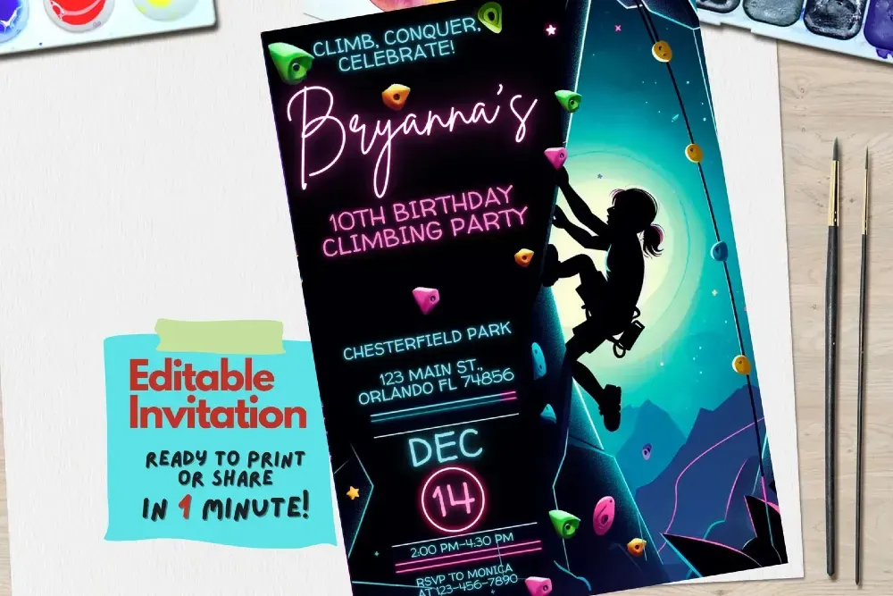 Consider choosing climbing-themed invitations or personalized digital designs from Etsy, like a printable rock-climbing birthday invitation template.