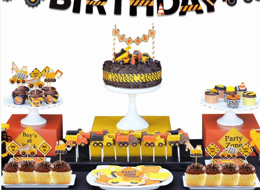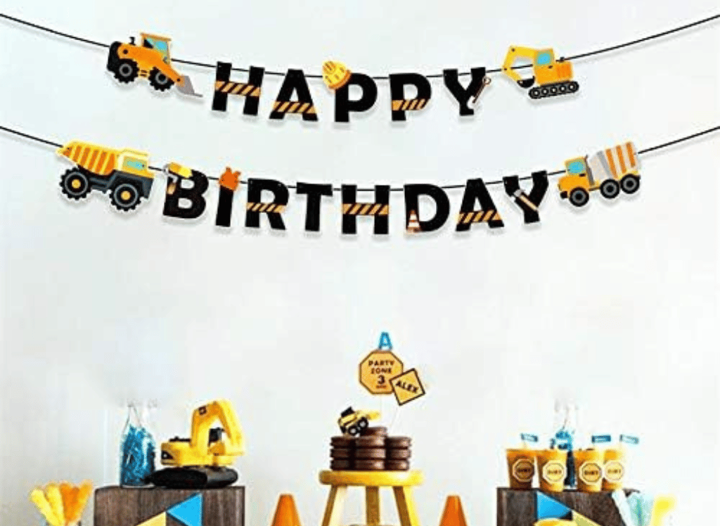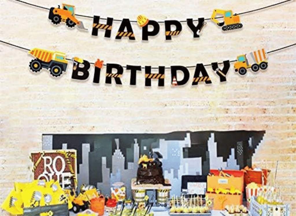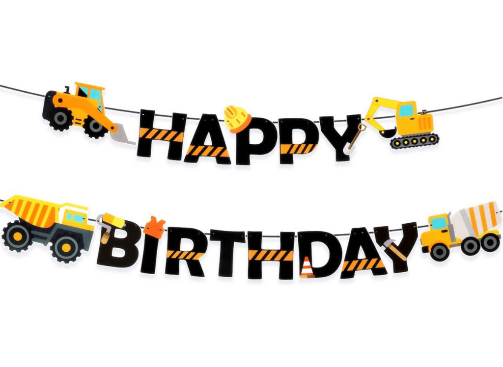 Some great decoration ideas for a construction-themed birthday party include construction signs, caution tapes, hard hats, and, if space allows, even some small construction toys. Balloons in colors like yellow, black, and orange also fit the theme well. A popular item is the Construction Birthday Dump Truck Garland, which you can hang across your party venue for a festive touch.