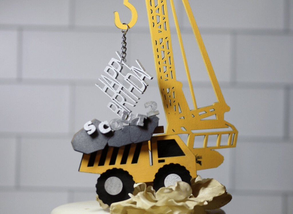 The MemoryKeepsakeParty Construction Themed Birthday Cake Topper is a great option. It includes two wooden toppers - a crane and a truck - personalized with the birthday boy's name and age. This topper gives a custom, quality touch to your birthday cake.
