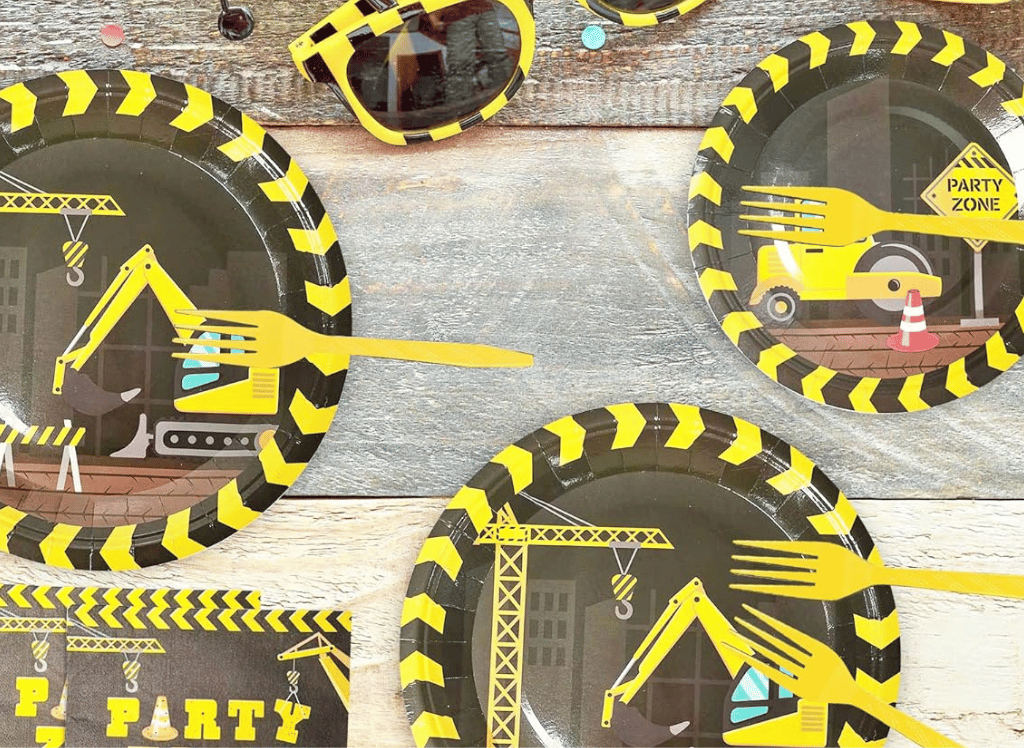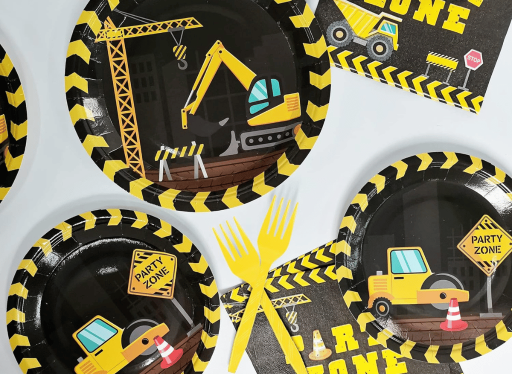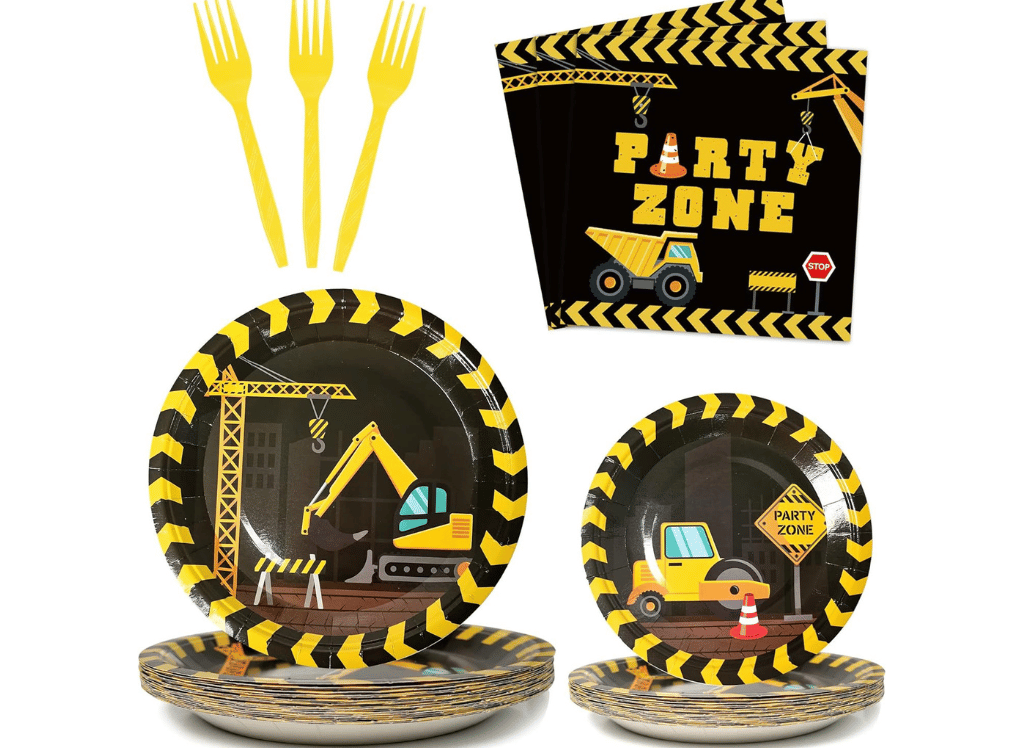A comprehensive pack like the Party Greeting Construction Birthday Party Supplies can be a convenient choice. It includes themed paper plates, napkins, and heat-resistant plastic forks for 24 guests.