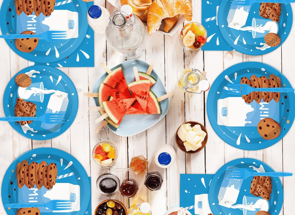Serving 24, this milk and cookies tableware set is a practical and stylish choice for your party! The fun designs and variety in sizes make serving a breeze, keeping with the cheerful theme. It’s a must-have for entertaining without the hassle of clean-up! 🍪