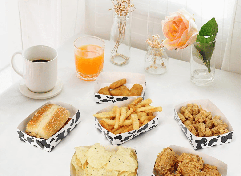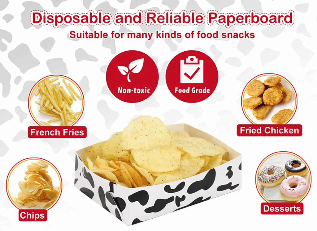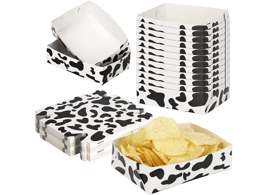 The Axyi 50 Pack Cow Print Paper Food Trays are perfect for adding a western flair to any event. These trays are great for holding food at cowboy or cowgirl themed events, such as baby showers, and make for great favor boxes for goodies.