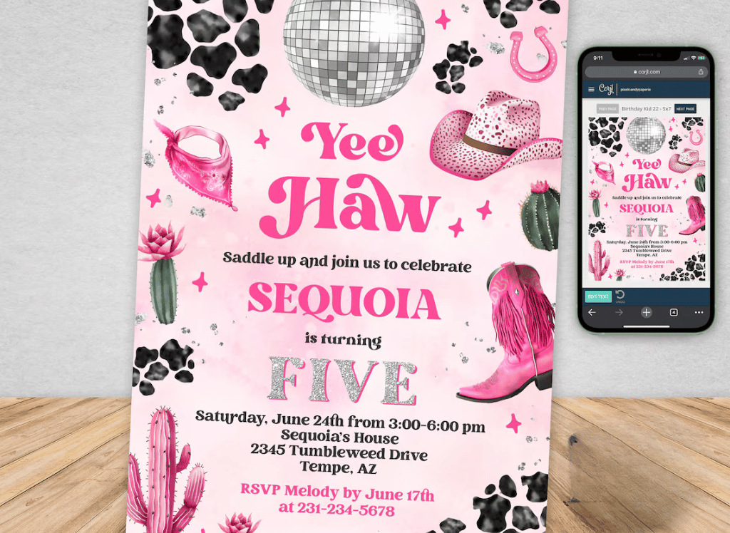 Adding a touch of wild west glam to your celebration has never been easier with our Editable Cowgirl Birthday Invitation π€ β¨. Customize your invite in a jiffy on any device, making party planning a breeze and fun! ππ» Plus, with instant download, you can kick-start the excitement for your pink disco cowgirl party right away. ππ