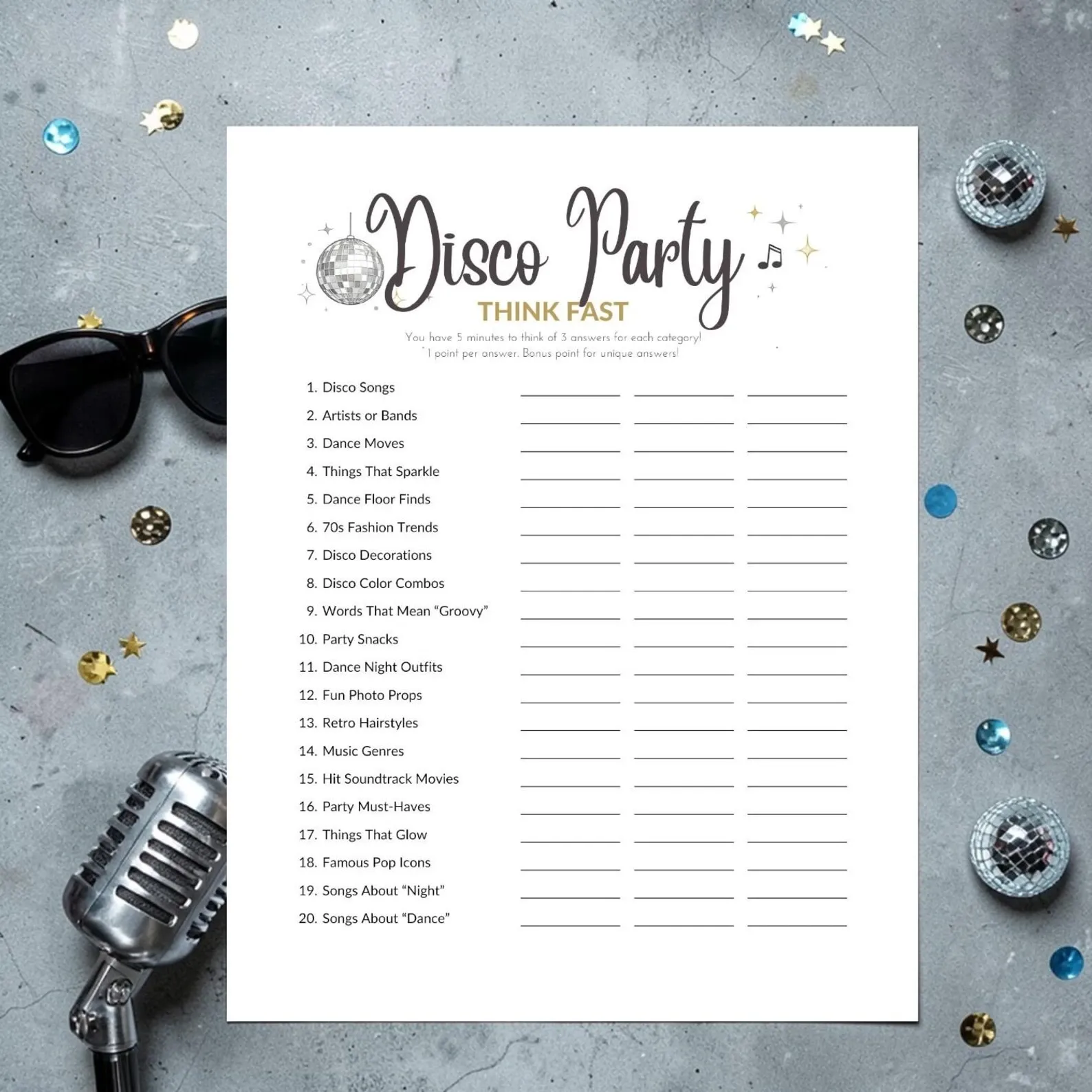 Interactive games are what turn a disco party from cute to unforgettable. A printable “Think Fast” challenge or disco-themed trivia game is an easy way to break the ice and get everyone laughing — especially if you split guests into teams.