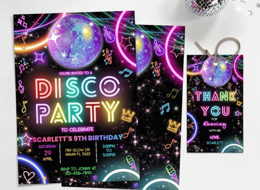Before the balloons go up and the music starts, it all begins with the invitation. These editable disco party invites set the tone right away with bold retro vibes and customizable details.