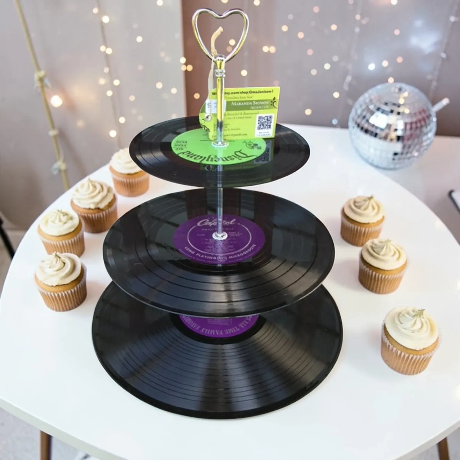 Let’s flip the record and talk about this vinyl 3-tier dessert stand. If you want a centerpiece that instantly screams “disco theme,” this is it. It turns an ordinary dessert table into a retro moment — and it photographs beautifully.